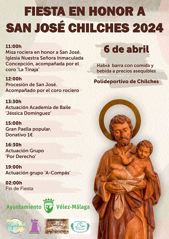 Por su parte, la concejala de Tradiciones Populares, Lourdes Piña, ha explicado los detalles de la programación prevista para este sábado. “La jornada dará comienzo a partir de las 11.00 horas con la tradicional misa rociera en honor a San José, en la Iglesia Nuestra Señora Inmaculada Concepción, que estará amenizada por la actuación del coro ‘La Tinaja’. Será a partir de las 12.00 horas cuando tendrá lugar el comienzo la procesión de San José acompañada por el coro rociero para recorrer junto a él las calles del pueblo de Chilches”, ha indicado la concejala.