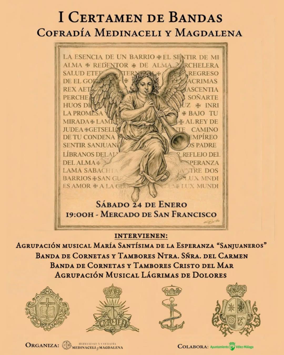 Vélez-Málaga acogerá la I edición del Certamen de Bandas, organizado por la Hermandad y Cofradía de Nuestro Padre Jesús Cautivo “Medinaceli” y Santa María Magdalena, con la colaboración del Ayuntamiento. El evento se celebrará el próximo 24 de enero, a partir de las 19:00 horas, en el Mercado de San Francisco, y reunirá a cuatro prestigiosas formaciones musicales, una de ellas del municipio: la Banda de Cornetas y Tambores del Santísimo Cristo del Mar.