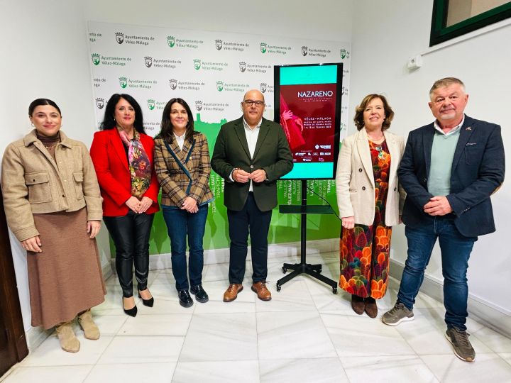 El alcalde de Vélez-Málaga, Jesús Lupiáñez, ha encabezado la presentación del programa de actos conmemorativos en honor a Jesús Nazareno “El Pobre”, acompañado por la concejala de Cultura y Patrimonio, Alicia Ramírez, la hermana mayor de la Cofradía, Inmaculada Carrera, el presidente de la Mancomunidad de Municipios, Jorge Martín, la responsable de Artes Plásticas de la Fundación Unicaja, Emilia Garrido, y la responsable de Marketing del Centro Comercial El Ingenio, Paula Muñoz. Los presentes han ensalzado el acierto en la elección de Sánchez Mesa y su muestra de nazarenos como elemento central de los actos de aniversario de la Archicofradía para rendir tributo a la bendición de su titular.