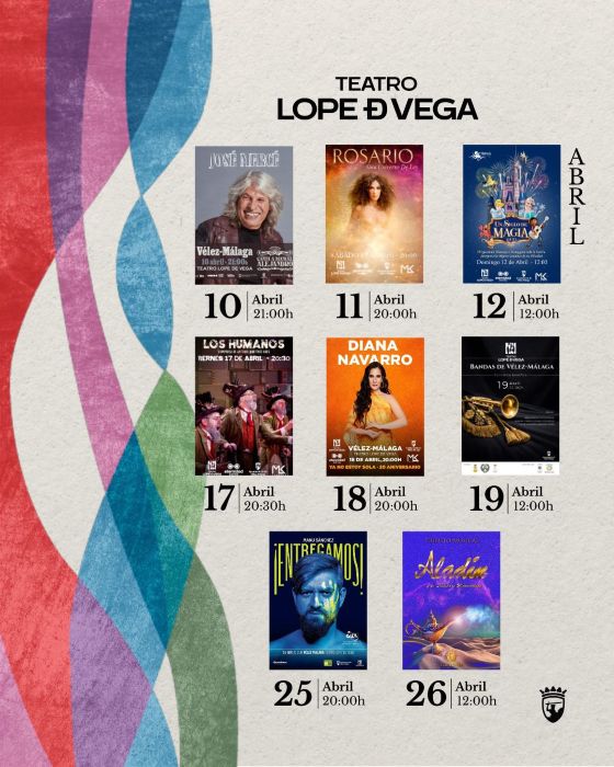 El Ayuntamiento de Vélez-Málaga ha presentado la programación cultural del mes de abril para el Teatro Lope de Vega, una cartelera que reunirá sobre su escenario a grandes figuras del panorama nacional como José Mercé, Rosario Flores, Diana Navarro o Manu Sánchez, además de musicales familiares, carnavales y concierto de bandas de música locales.