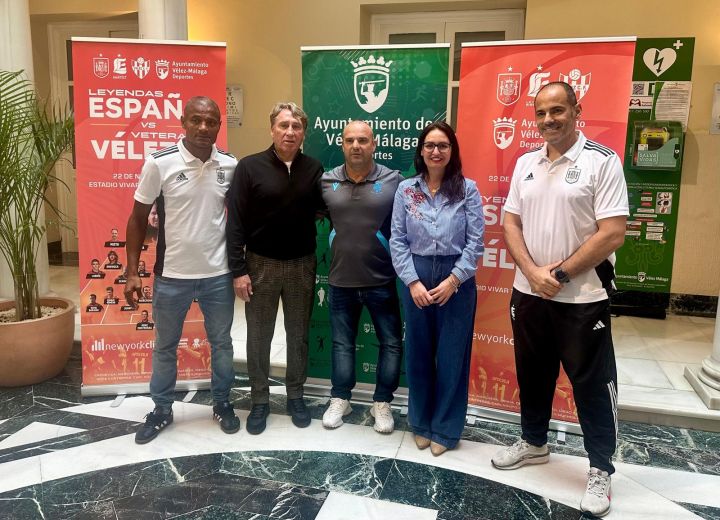 La concejala de Deportes, Rocío Ruiz, ha presentado este encuentro histórico que se disputará el próximo 22 de noviembre junto al presidente de las Leyendas nacionales, Salva Ballesta, el veleño Esteban Vigo, el exjugador Catanha, y los representantes del Vélez CF Veteranos, Francisco Alba ‘Papi’, David Arcas y Juanjo Bautista.