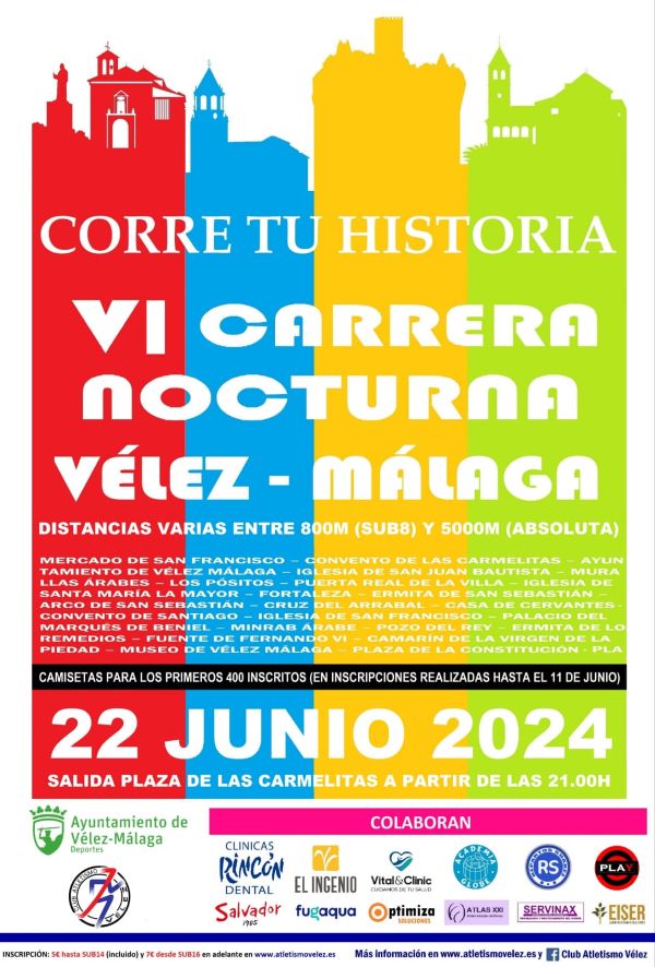 El Ayuntamiento de Vélez-Málaga, a través de su Concejalía de Deportes y junto con el Club Atletismo Vélez, organizan la VI Carrera Nocturna Ciudad de Vélez-Málaga ‘Corre tu Historia’, que se llevará a cabo por las calles del Centro Histórico de Vélez el próximo sábado 22 de junio y que se ha convertido en todo un clásico en el calendario de pruebas locales.