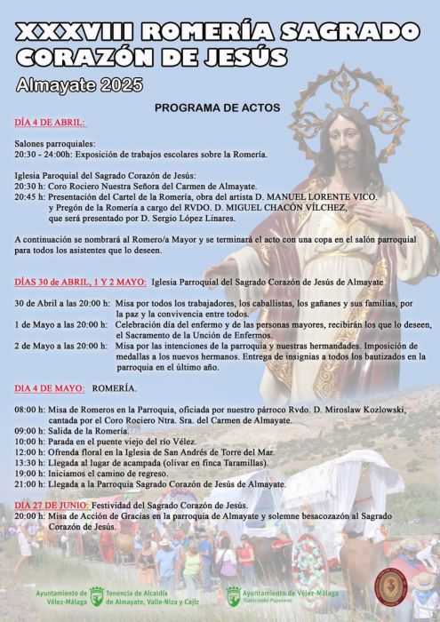 La flamante imagen del Sagrado Corazón de Jesús iniciará su paseo triunfal hacia la finca Taramillas el día 4 de mayo a partir de las 8:00 horas, previa misa de romeros a cargo del párroco reverendo Miroslaw Kozlowski, con el cante de fondo del coro de Nuestra Señora del Carmen de Almayate. A las 9:00 horas, comienzo estelar del recorrido romero, con parada en el puente viejo del río Vélez, y tradicional ofrenda floral a las 12:00 horas en la iglesia de San Andrés de Torre del Mar. Está prevista la llegada a destino a las 13:30 horas, donde los integrantes de la comitiva acamparán para disfrutar de un día que será, como es habitual, de inolvidable recuerdo.