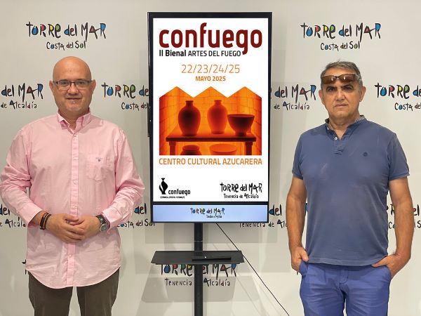 El primer teniente de alcalde del municipio de Vélez-Málaga y teniente de alcalde de Torre del Mar, Jesús Pérez Atencia, junto al director de la Escuela de Arte D’Art, José Manuel Molina Castro, han presentado esta mañana la II Bienal «Confuego – Artes del Fuego», que se celebrará los días 22, 23, 24 y 25 de mayo de 2025 en el Centro Cultural Azucarera de Torre del Mar.