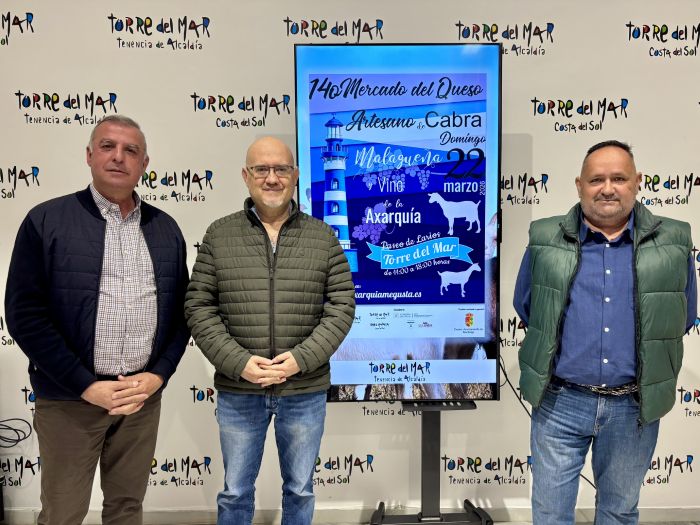 El primer teniente de alcalde del municipio de Vélez-Málaga y teniente de alcalde de Torre del Mar, Jesús Pérez Atencia; el alcalde de Moclinejo, Antonio Muñoz; y el gerente de Axarquía Me Gusta, César Díaz, han presentado una nueva edición del Mercado de Queso Artesano de Cabra Malagueña y Vino de la Axarquía, que se celebrará el próximo 22 de marzo en el Paseo Larios de Torre del Mar.