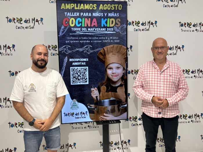 El primer teniente de alcalde del Ayuntamiento de Vélez-Málaga y teniente de alcalde de Torre del Mar, Jesús Pérez Atencia, acompañado por el chef y gerente de la Escuela Sabores de Torre del Mar, Roberto Soler, ha anunciado este viernes la ampliación de los talleres de cocina infantil organizados en Torre del Mar, tras el éxito de participación registrado durante el mes de julio.