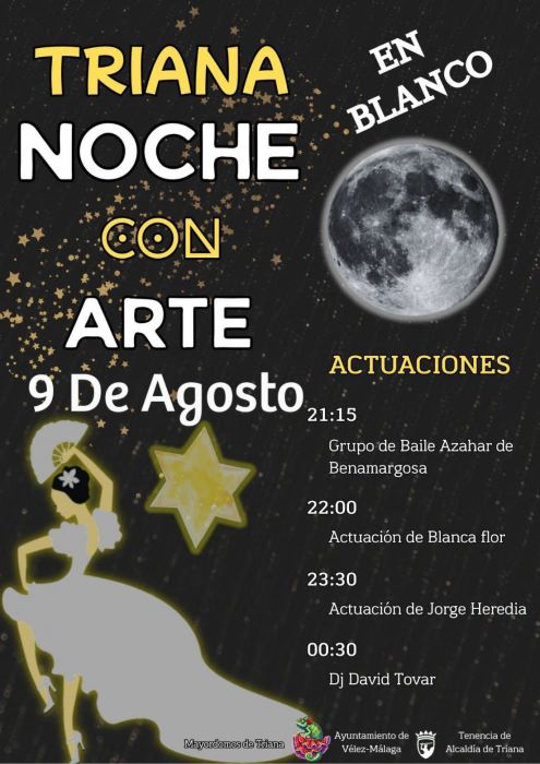 El Ayuntamiento de Vélez-Málaga, la Tenencia de Alcaldía de Triana, junto al siempre encomiable trabajo de los Mayordomos del núcleo urbano, traen de vuelta la “Noche Con Arte” en blanco, una actividad veraniega muy esperada y demandada por los habitantes de la zona. Los vecinos y visitantes vivirán el próximo 9 de agosto una jornada de diversión, disfrute y convivencia bajo las estrellas.
