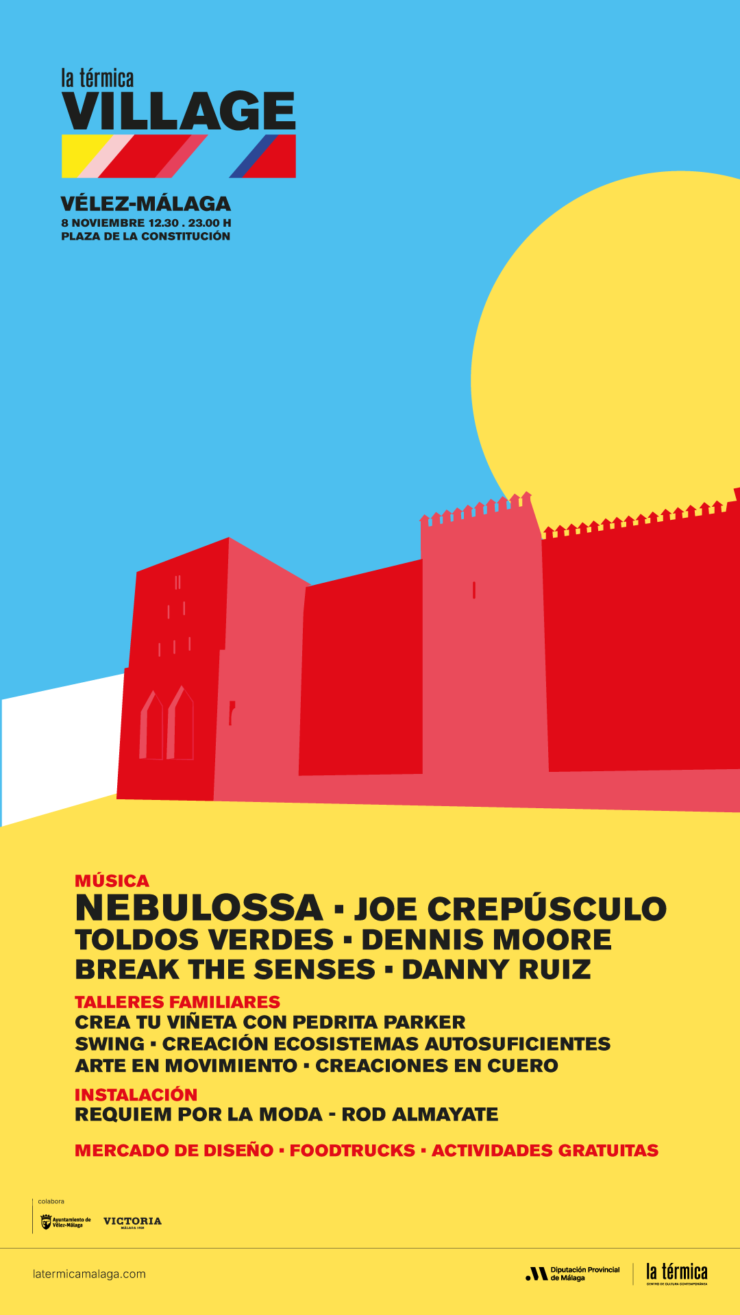 El macro espacio musical acogerá una jornada de más de diez horas ininterrumpidas de actividad musical, conciertos en directo, talleres didácticos, exhibiciones de baile, diseño y gastronomía. La entrada es gratuita y la programación se extenderá desde las 12.30 y hasta las 23.00 horas. Se espera que en torno a 20.000 personas de todas las edades en Vélez-Málaga, Torremolinos, Antequera, Rincón de la Victoria y Alhaurín de la Torre copen las cuatro citas, que, tal y como ha desvelado el director, Antonio Javier López, “cuenta con la estrecha colaboración de los ayuntamientos y Diputación Provincial. Nuestro propósito con este proyecto es poder llevar la esencia de La Térmica a otros puntos de la provincia con propuestas novedosas y atrayentes para el público más diverso, para los veleños, los vecinos de pueblos de la comarca y todos los que quieran acercarse hasta aquí para disfrutar de un sábado inolvidable”, ha detallado.