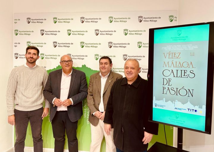 El alcalde de Vélez-Málaga, Jesús Lupiáñez, respaldado en la mañana de hoy por el presidente de la Agrupación de Cofradías, Rafael Moreno, el concejal de Centro Histórico, Juan Fernández Olmo, y el representante de Tito Gestión Cofrade, Javier Aranda, ha anunciado la presencia este fin de semana de “Calles de Pasión”, una cita cofrade sin parangón en nuestra tierra y que acogerá a representantes de la Semana Santa provenientes de diferentes rincones de Málaga, Granada o Córdoba. El evento previo a nuestra Cuaresma tendrá lugar sábado 1 y domingo 2 de marzo distribuido por los principales emplazamientos del casco histórico veleño. Se desarrolla con la colaboración de Diputación Provincial de Málaga.