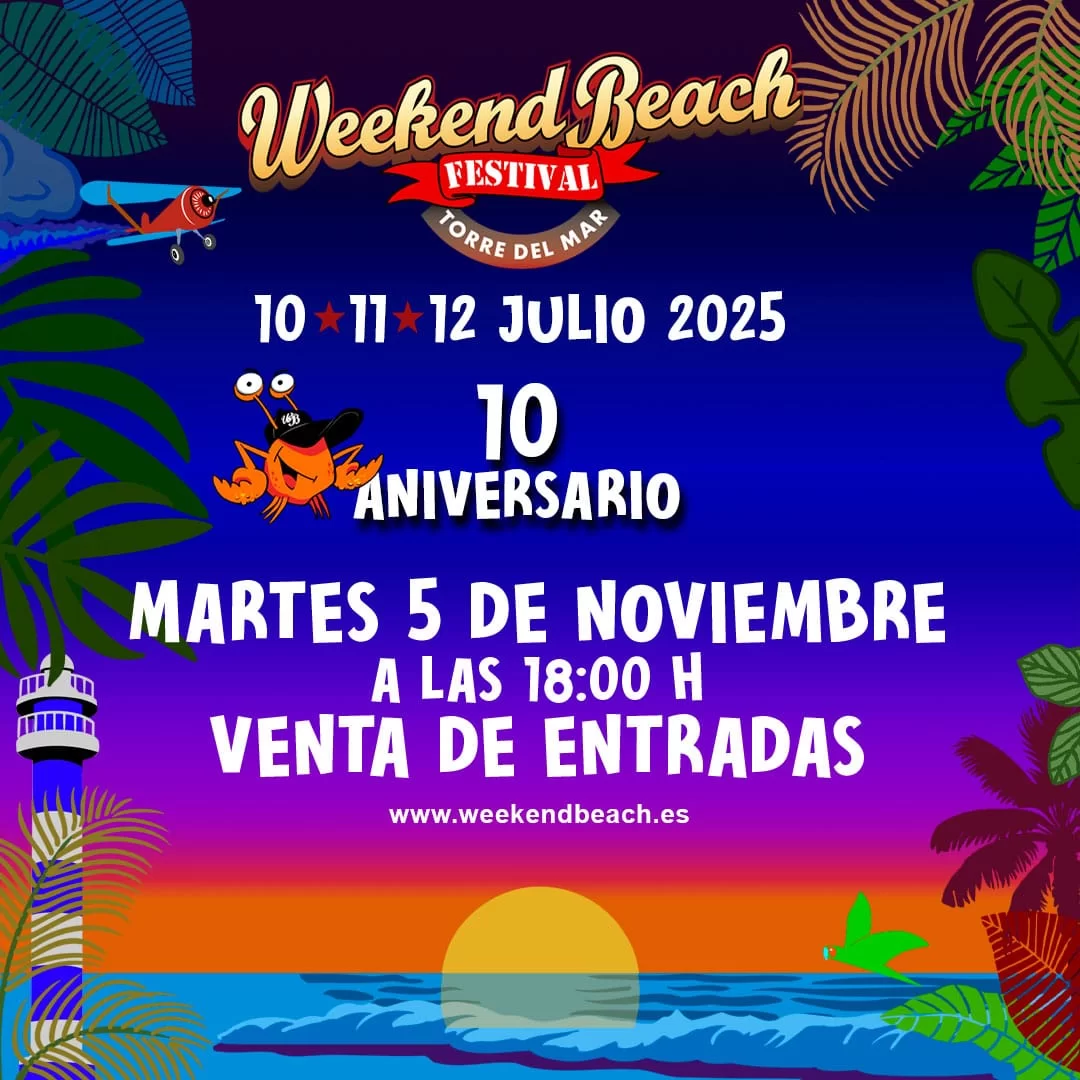 WEEKEND BEACH FESTIVAL TORRE DEL MAR celebrará su 10ª Aniversario de una forma muy especial a orillas del Mediterráneo, en pleno corazón de la Costa del Sol malagueña, los días 10, 11 y 12 de julio de 2025, un  plan de vacaciones único que promete un cartel de lo más atractivo lleno de la mejor y más actual música para que los weekers lo agenden desde ya en sus calendarios de verano.